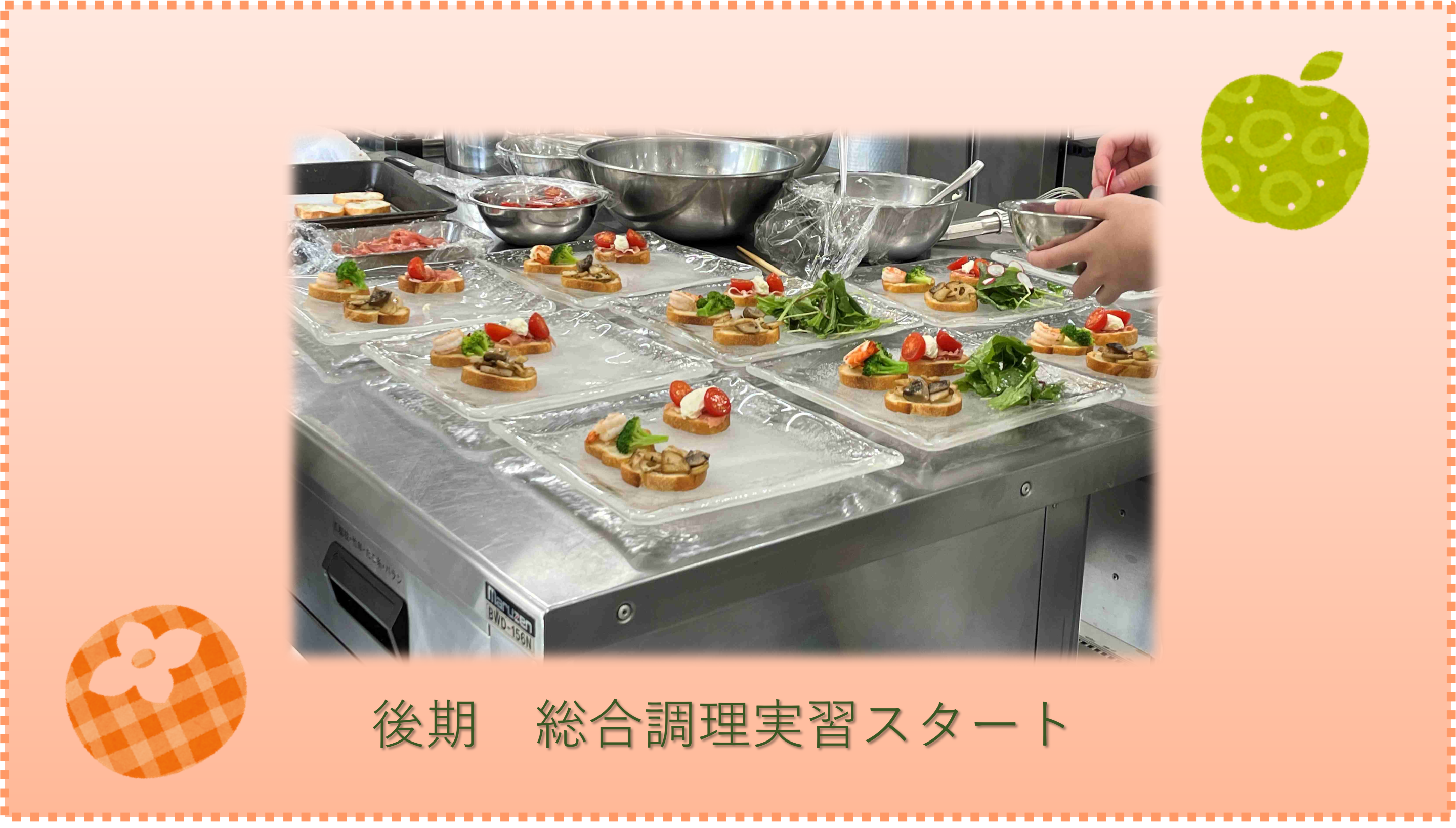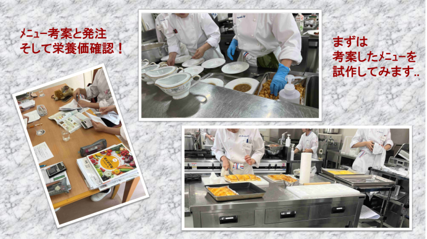 後期の授業が始まり、3年生では総合調理実習が本格化して参りました! 上の写真は、総合調理実習の授業初回に西洋コース料理を各グループで考案してシェフの先生にアドバイスをいただき、次の回で試作しているところです。