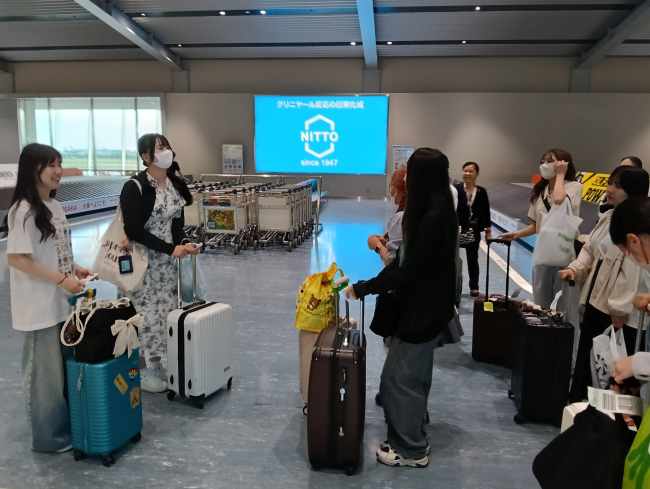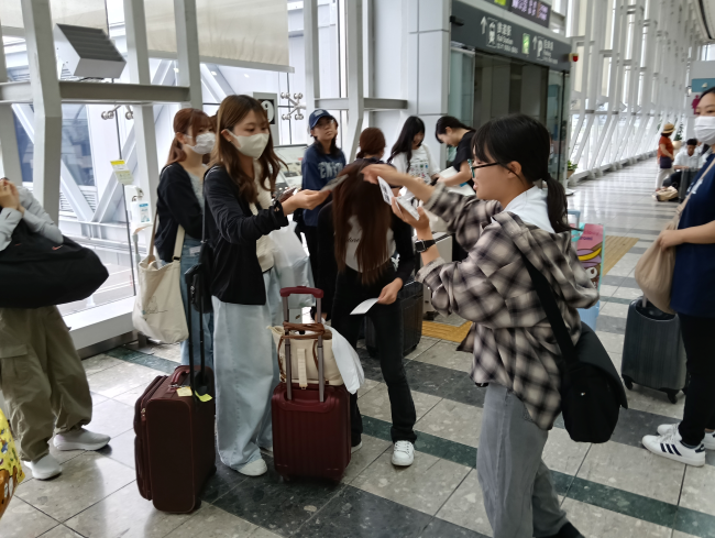 仙台空港に到着後、添乗員役の学生によってすみやかに点呼がとられ、搭乗手続きが始まります。疲労がたまってきたお客様たちへの配慮も忘れません。