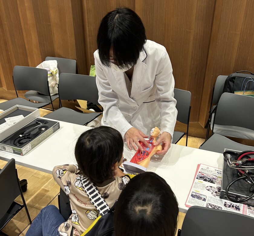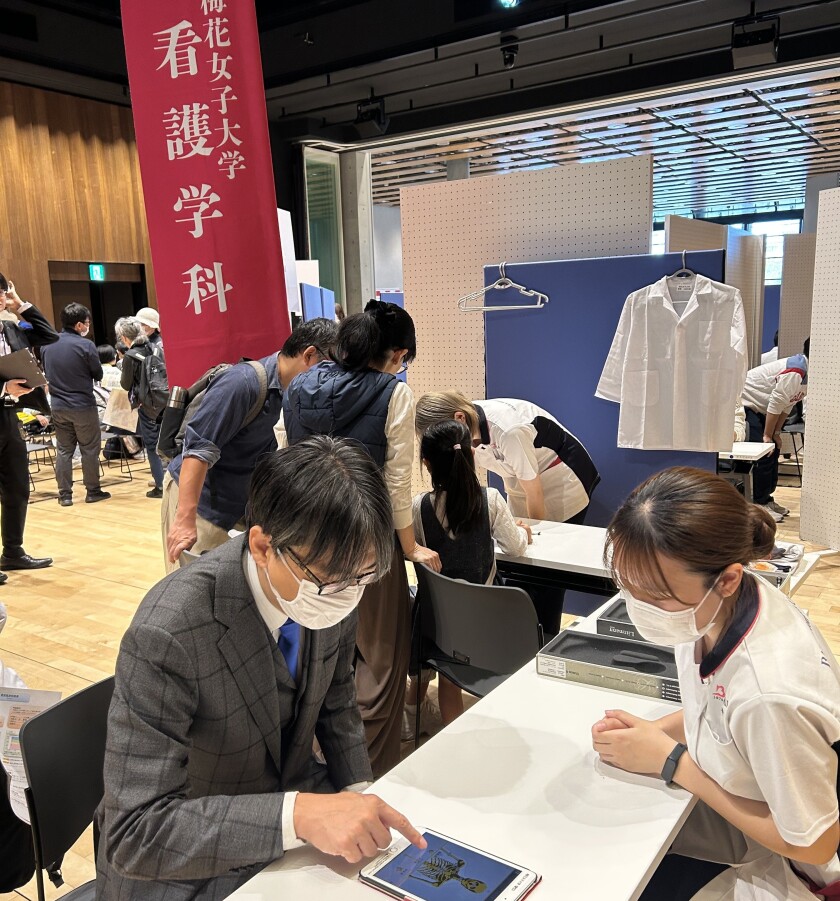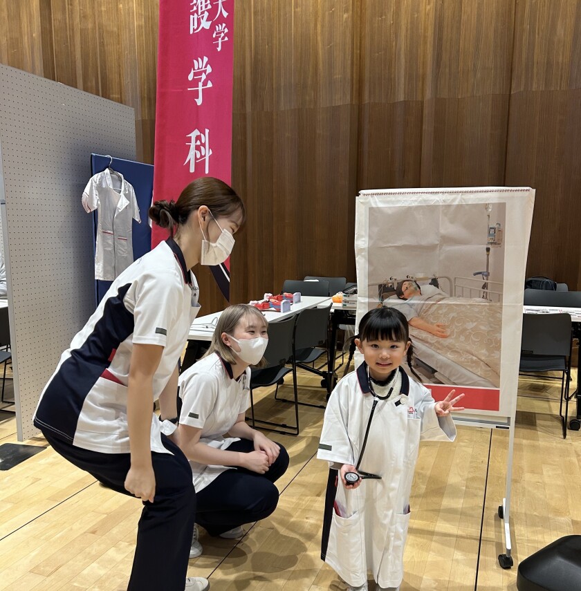 看護学科ブースでは、「からだのパズルをやってみよう」「自分の呼吸音を聞いてみよう」「こどもの看護服着用体験」などの体験企画を実施しました。