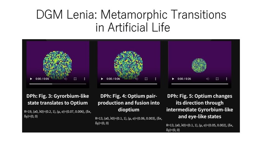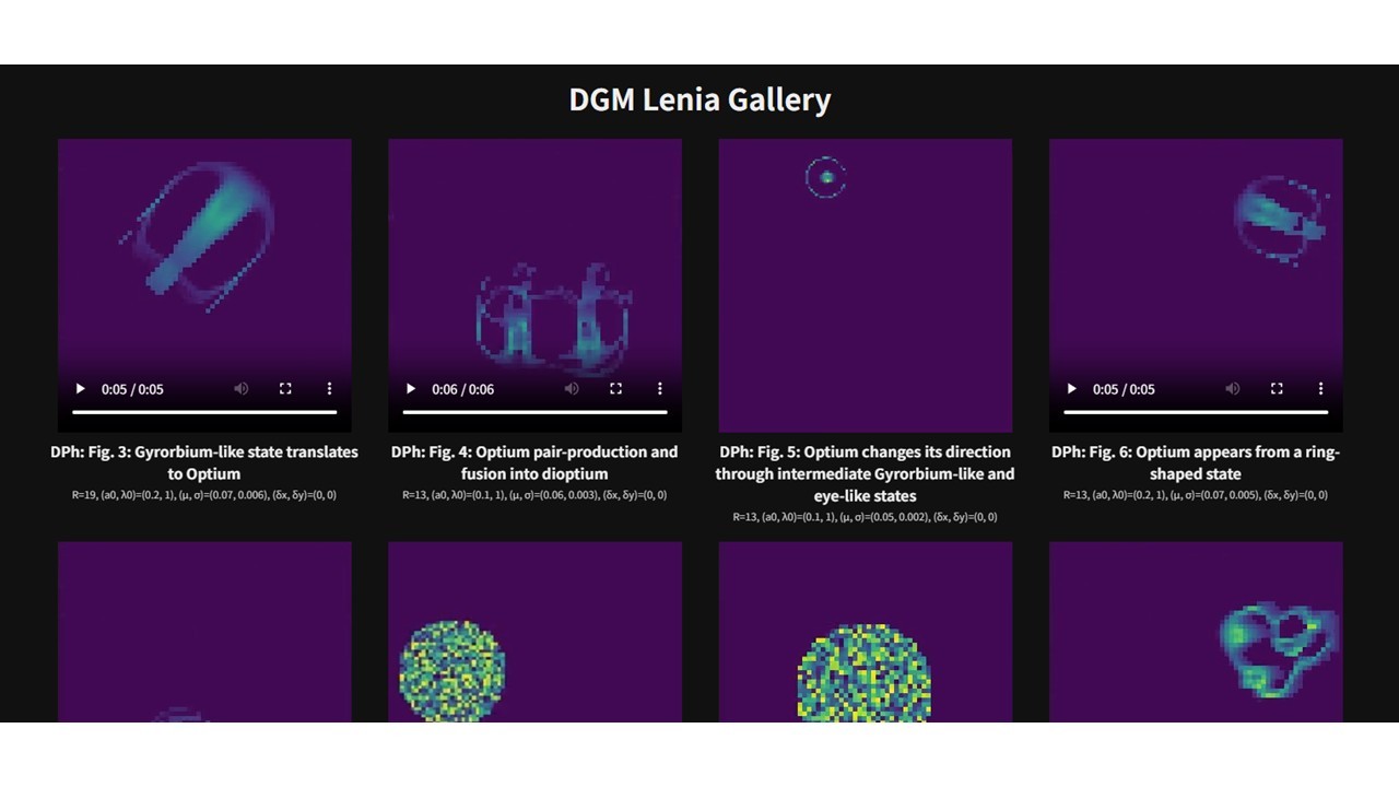 特に、カーネル移動のオフセットベクトル(δ)は回転対称性を破り、Optium/Dioptiumクラスの生命体出現とその遷移を大幅に増強します。DGM Leniaシミュレーションでは、対生成や融合、変態に似た多様な生命体の挙動が観察され、生命の進化経路を示唆します。写真はその成果の一部です。