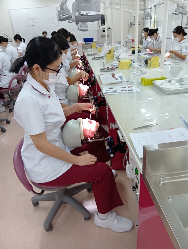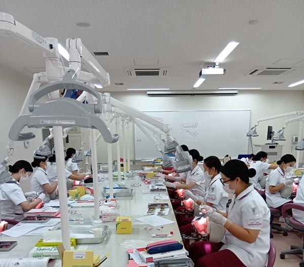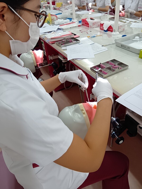 1年生がう蝕予防処置の授業で簡易防湿の実習を行いました