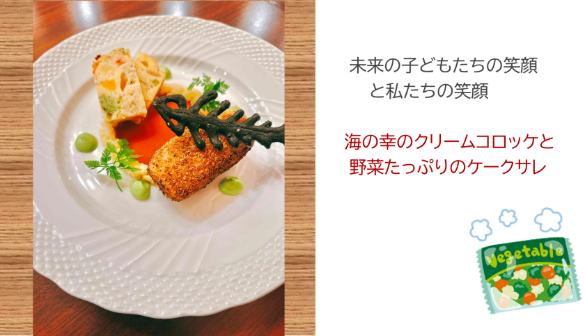 全て一度冷凍した野菜を用い、魚介はムース状にしてクリームコロッケに、野菜は栄養満点のケークサレに仕上げ、グルテンフリーにしています。また、魚の骨型チュイールやカレーリゾットを添えることで、子どもたちのワクワク感も演出しました。このひと皿から子どもが食べて喜ぶ姿、それを眺めて笑う私たちを想像することができるように工夫しました。