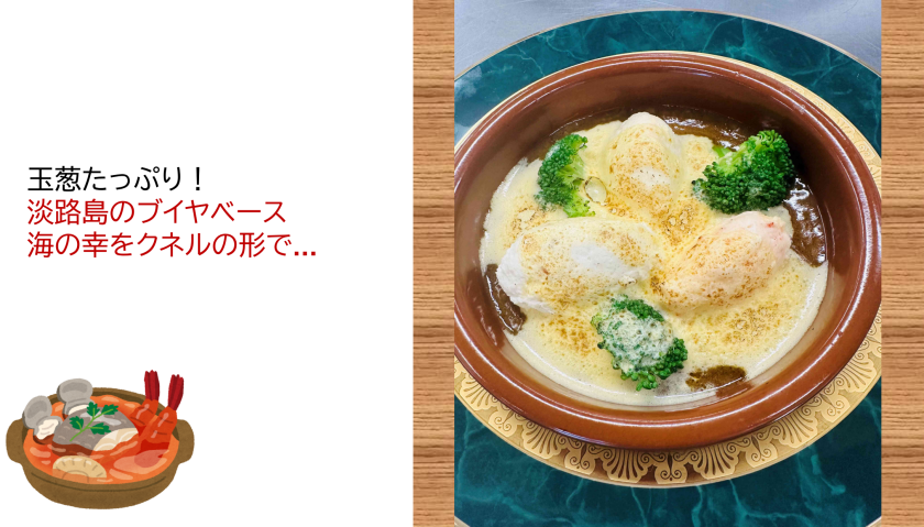未来の子どもたちに伝えたい私の大好きなブイヤベースです。魚をそのまま使うのではなく、子どもたちの大好きなお団子をイメージして、真鯛とエビとホタテ貝を使ってムース状にし、お団子の形に似たクネルにしました。さらに、ブイヤベースの上に子どもが食べやすいように、マヨネーズを加えたサバイヨンソースをかけることで、大人にも子どもにも喜んでもらえる一品に仕上げました。