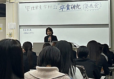 最後に、学科長の江上先生から発表会の講評と、「今後は、卒業論文を完成させるとともに、第40回管理栄養士国家試験合格に向けて最後まで頑張りましょう!」との激励のお言葉をいただきました。