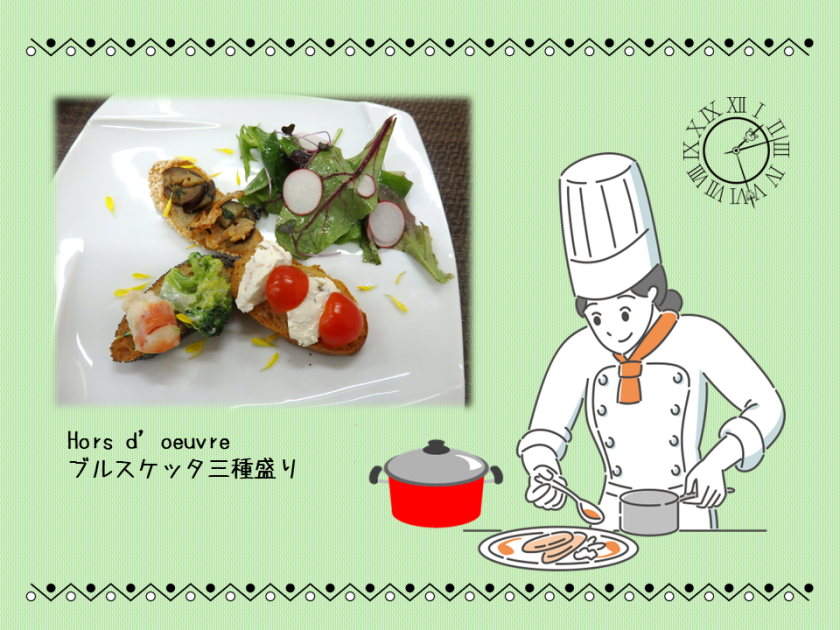 コースは、前菜ブルスケッタの三種盛りでスタート。