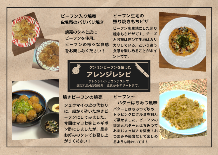 また、同じくお土産で頂いた「焼ビーフン」を用いて、学生たちがアレンジレシピを考案しコンテストを開催しました。試行錯誤の末に完成した多彩なメニューの中から選ばれた4品を、今回はご紹介させていただきます。