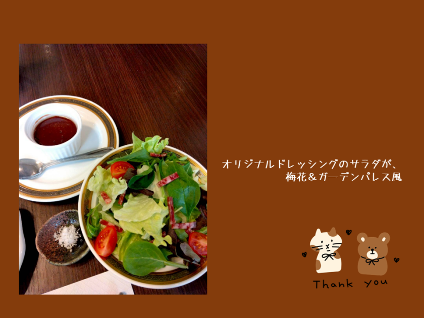 梅花&ガーデンパレス流アフタヌーンティーでは、かならずサラダが提供されるのがお約束。