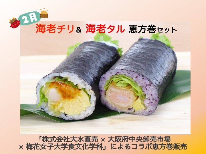 本年も、2月3日 節分の日に、「株式会社大水直売 × 大阪府中央卸売市場 × 梅花女子大学食文化学科」によるコラボ恵方巻を販売いたしました。このプロジェクトも今年でついに12年目!学科を代表する伝統行事のひとつとなっています。この取り組みは、食文化学科の1年生が入学後初めて挑戦する「商品企画」の実践の場です。レシピを考案するだけでなく、市場のニーズや各地の食文化を徹底的にリサーチ。グループワークを通して約半年間、試行錯誤を繰り返して作り上げます。