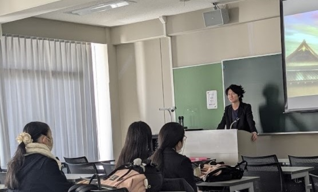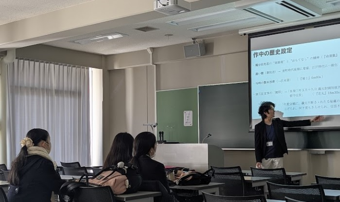 今回のミニ授業は、歴史学を専門にしている熱田順先生の解説を聞きながら、大スクリーンでアニメを視聴するという形式で行われました。