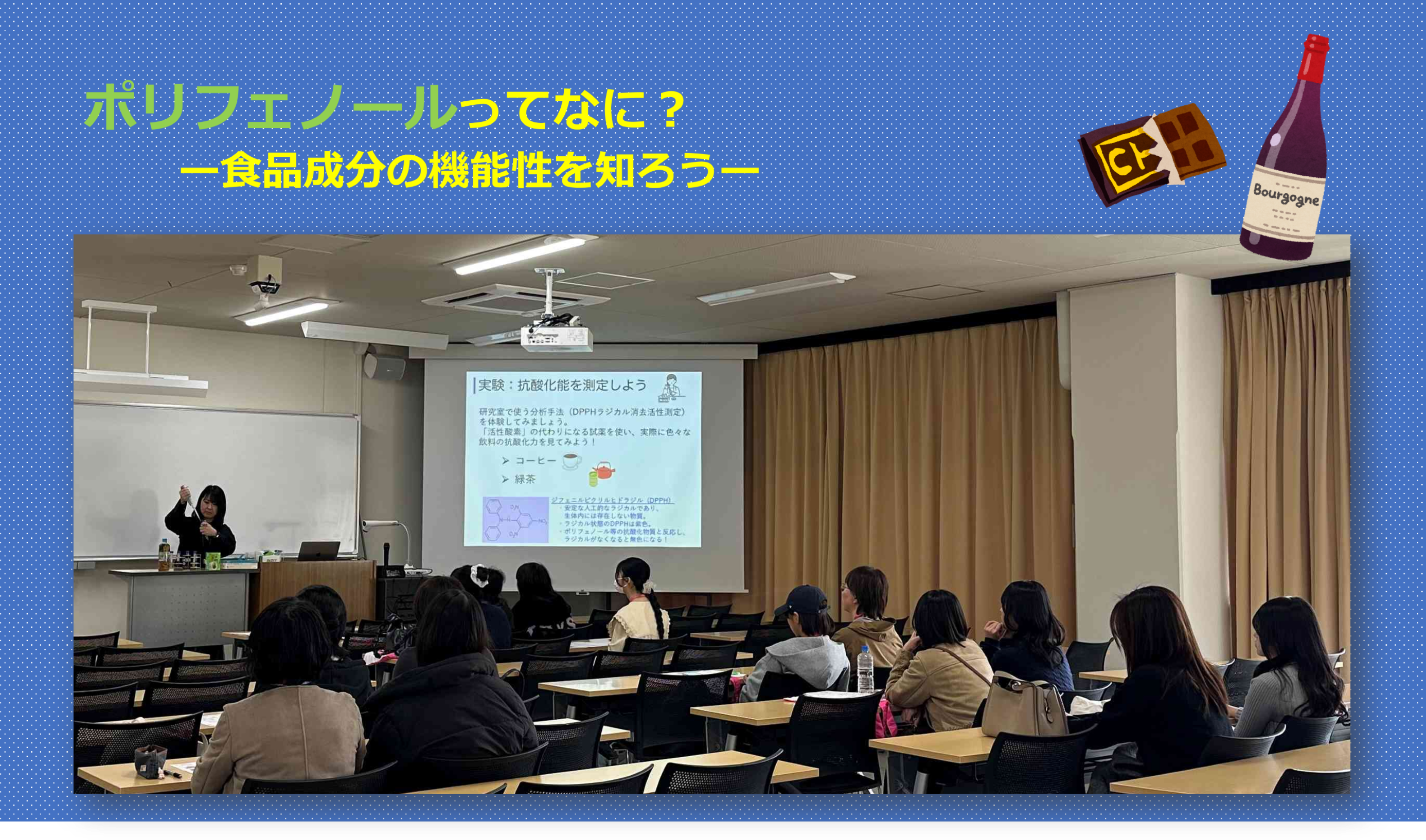 今回のミニ授業では、食品学をご担当されている才田先生より、「ポリフェノールってなに?ー食品の機能性を知ろうー」についての講義が行われました。私たちの身体は、日々口にする食べ物からつくられています。食品に含まれるポリフェノールには抗酸化作用があり、体内の活性酸素を除去する働きがあります。そのため、動脈硬化などの生活習慣病の予防や、老化防止といった効果が期待されています。
