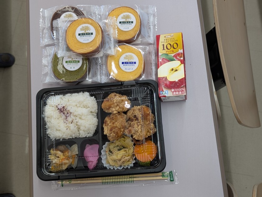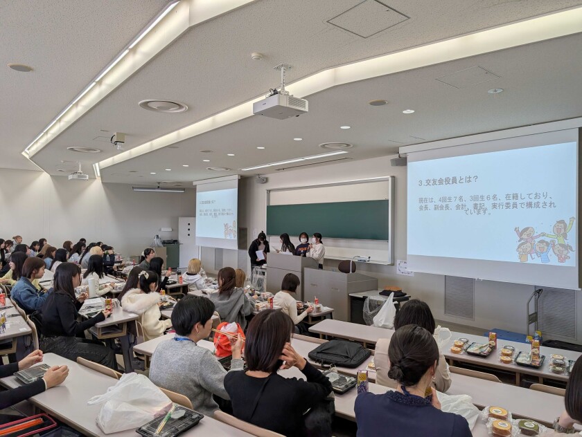 歓迎会では、交友会が用意してくれた美味しいお弁当やジュース、お菓子を食べながら、大学生活についての紹介を聞いたり、新入生からの質問に交友会メンバーが答えるなど、先輩後輩の交流が深まりました。