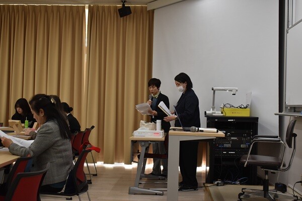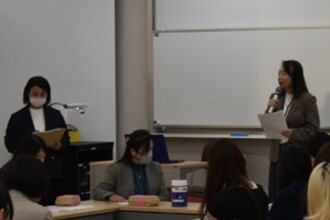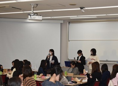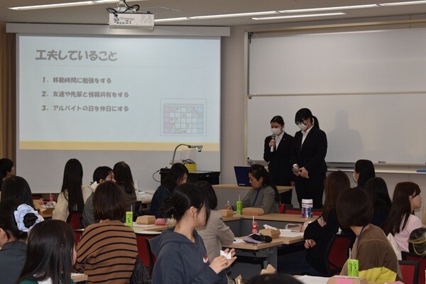 在校生からは、卓球部に所属する2年生と4年生の2名が、4年生になるまでの実習内容や、学業・部活動・アルバイトとの両立の工夫などについて話し、新入生へ応援メッセージを送りました。