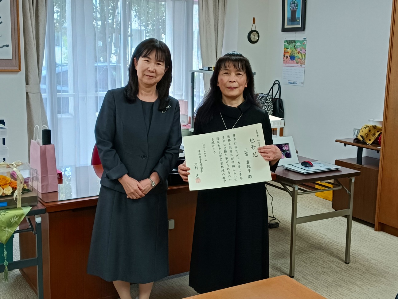 授与式では、河村圭子学長から称号記が手渡され、三雲先生のこれまでの歩みを称える温かな時間が流れました。